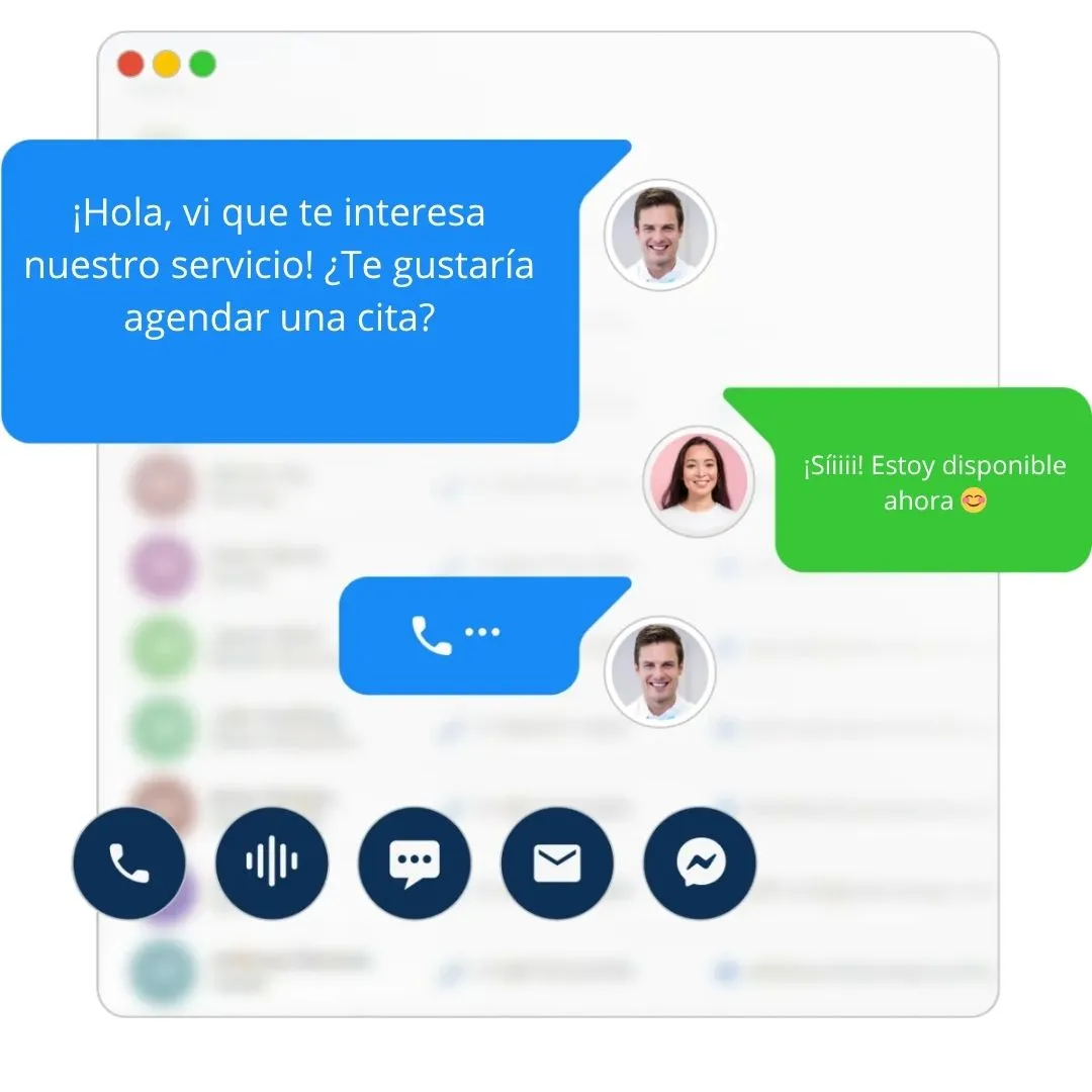 Usa llamadas, WhatsApp, SMS, email o Messenger. El sistema manda los mensajes por el canal que más usan tus clientes.Habla con ellos desde cualquier lugar