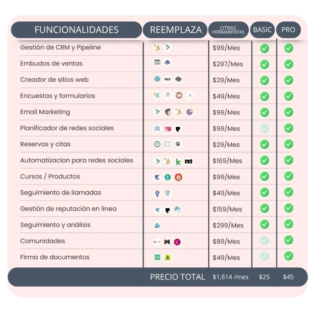 Con nuestra suscripción, reemplazas más de 10 herramientas distintas y ahorras hasta $1.500 dólares al mes. No necesitas aprender ni gestionar nada extra: todo lo que tu negocio digital necesita, en una sola plataforma y por un solo precio.